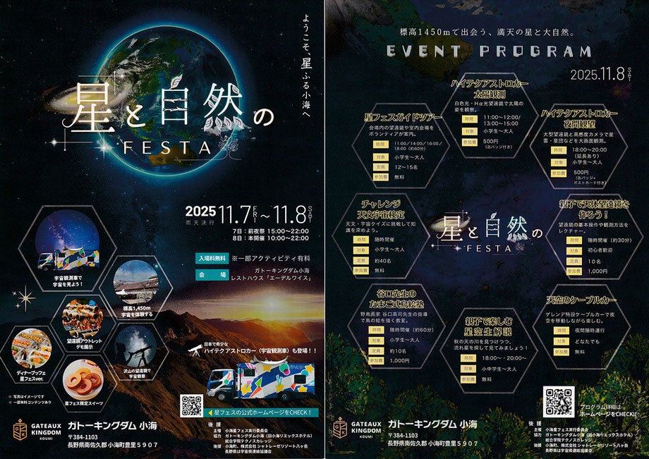 株式会社サイトロンジャパン(本社:東京都新宿区、代表取締役:渡邉晃)は、2025年11月7日(金)から11月8日(土)に長野県小海町のガトーキングダム小海・レストハウス「エーデルワイス」で開催される「八ヶ岳 星と自然のフェスタ」に出店します。