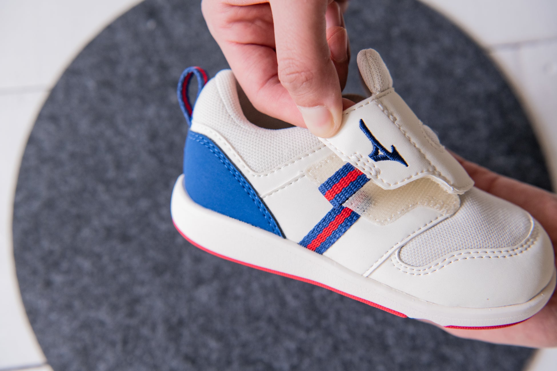 『ピットイン構造』は、ベロとベルトが一体化しているアッパーのため、ベルトを開けば簡単に足を入れることができます。アッパーは、開いたままの状態をキープできるハンズフリーベルトのため、子どもが履いている途中でベロが戻る心配もありません。子どもを抱っこしながらでも、片手で履かせることができる構造です。