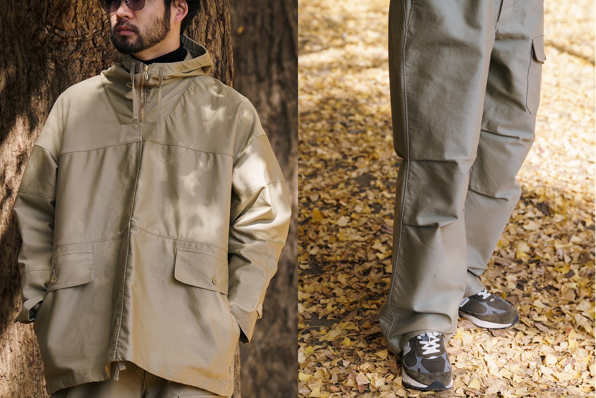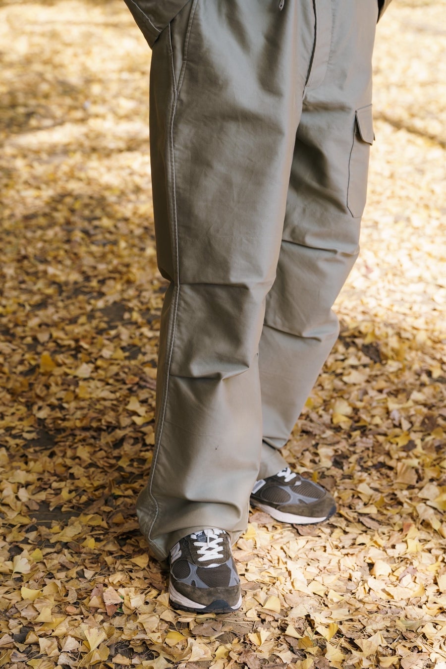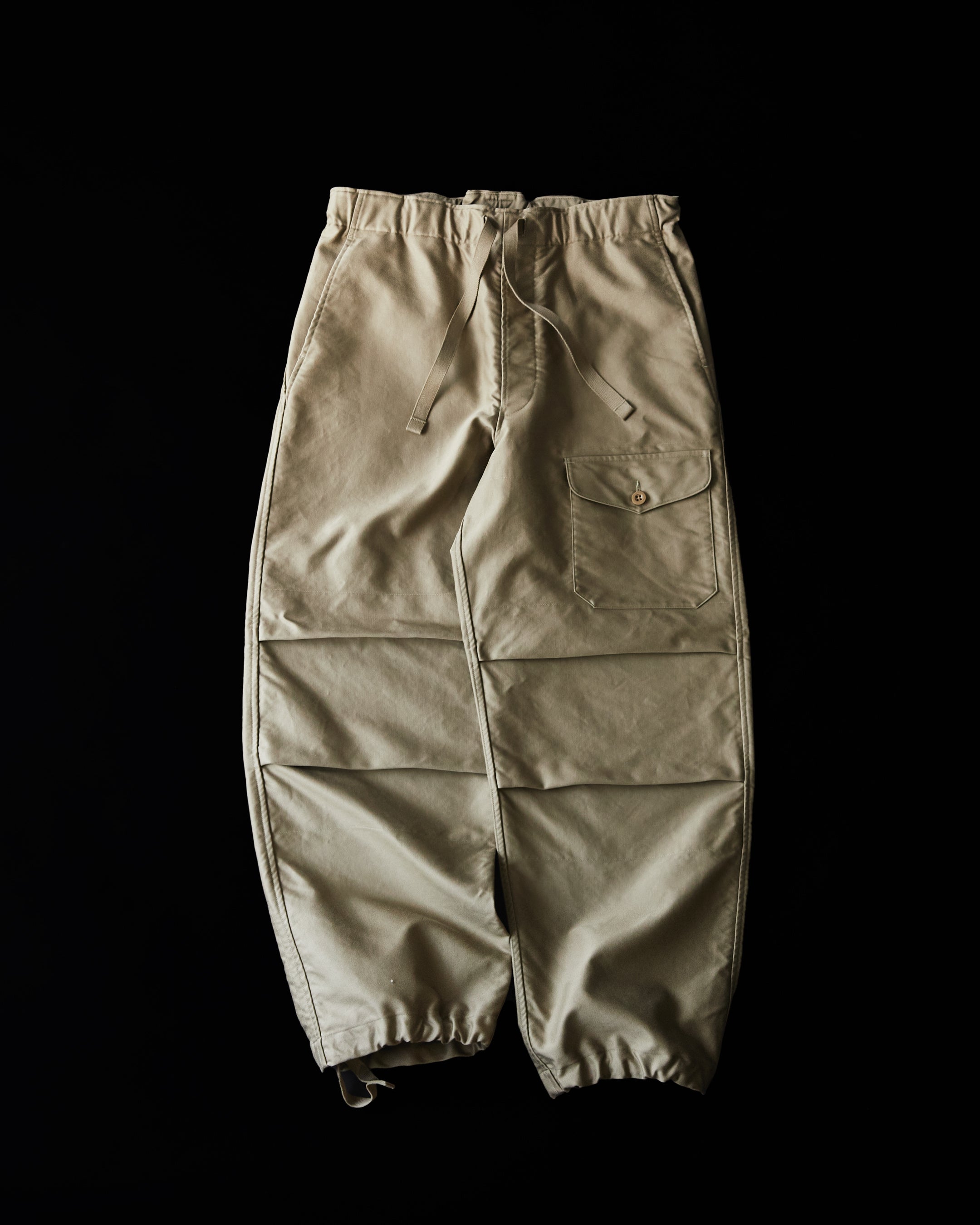 オーセンティックなイギリス軍のオーバーパンツをベースに、歩きやすく、動きやすくするためのディテールを取り込んだランブリングトラウザーズ。裾のドローコードを絞ることでシルエットの変化を楽しむことができます。一般的なドローコードは絞ったあとに真下に紐が垂れ下がりますが、内側に配備したボタンで留められる仕様に。紐が外に出ない仕様のため、歩いているときも気にならず、快適なランブリングを楽しめます。
