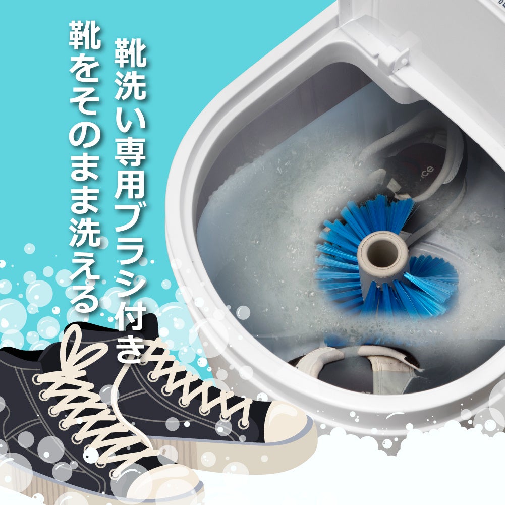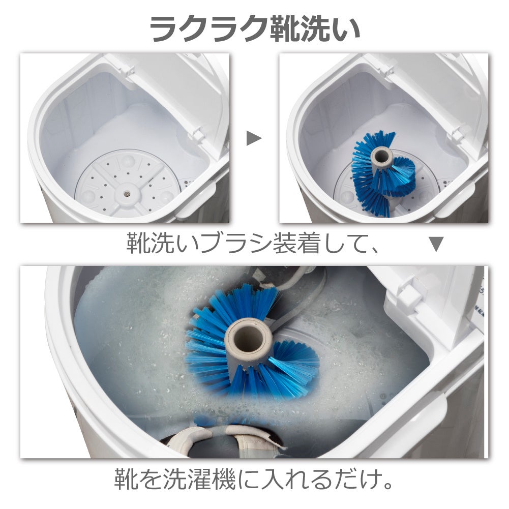 シューズやスニーカーをそのまま洗える専用ブラシ付き。ブラシを装着して、靴を洗濯機に入れるだけ。
