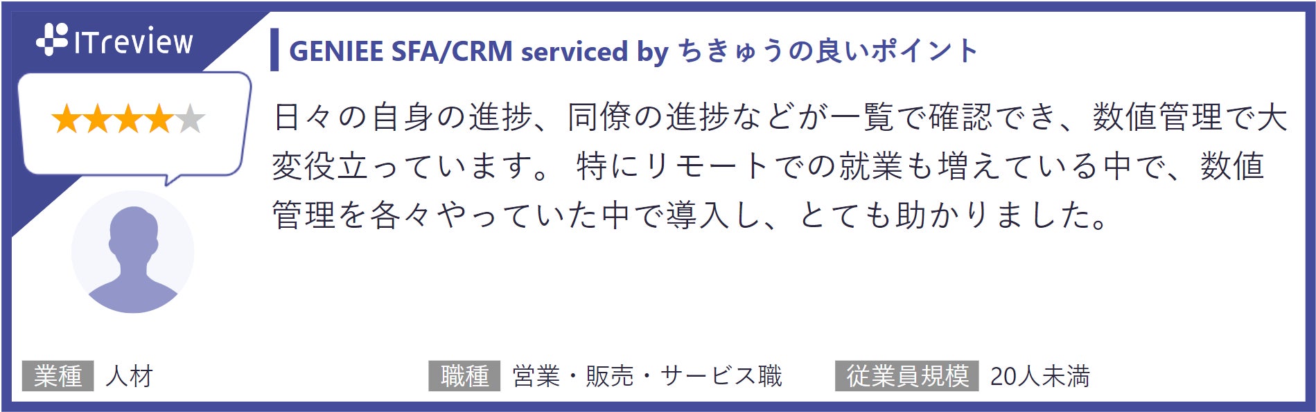 今回の「ITreview Grid Award 2024 Summer」は2024年6月までに掲載されたレビューの集計結果をもとに選定されています。「GENIEE SFA/CRM」を活用した営業進捗の可視化による社内での情報共有や会議の質改善に関する高評価のコメントが多く寄せられました。