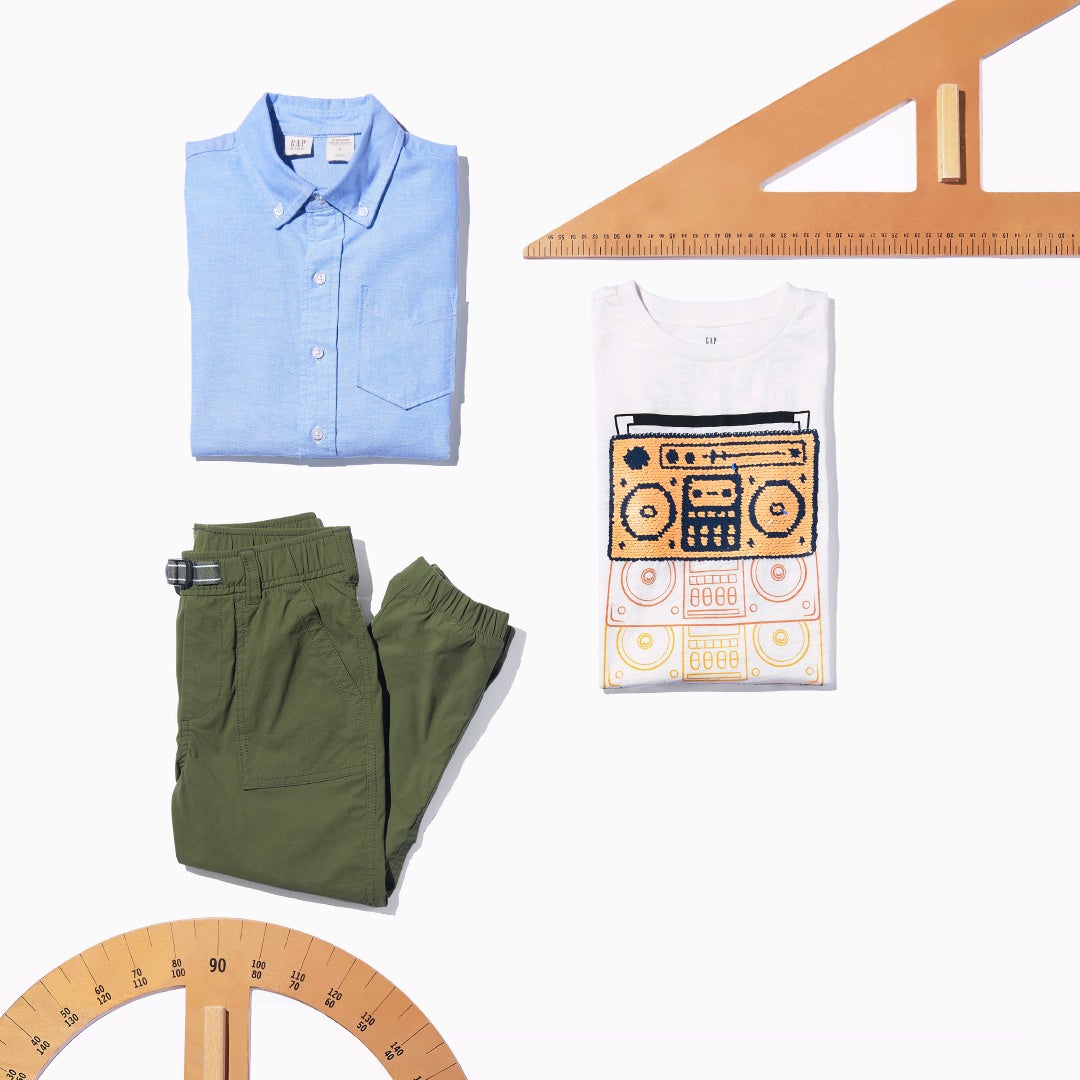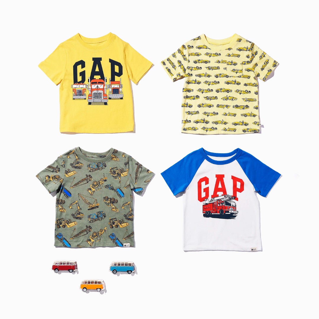 シンプルなトップスにデニムを合わせ、大人っぽいおしゃれなコーデで新学期を心待ちにしている「#大人コーデも勉強中」や、Gapロゴフーディーとアクティブなショーツで元気いっぱいの「#レギュラーになるぞ!」、キッズ達が大好きな乗り物がプリントされたTシャツの「#お気に入りのTシャツでいってきまーす!」、カラフルなチェック柄のドレスが春らしい「#保育園にはお気に入りのチェックで」など、通学・通園におすすめのスタイリングを提案しています。