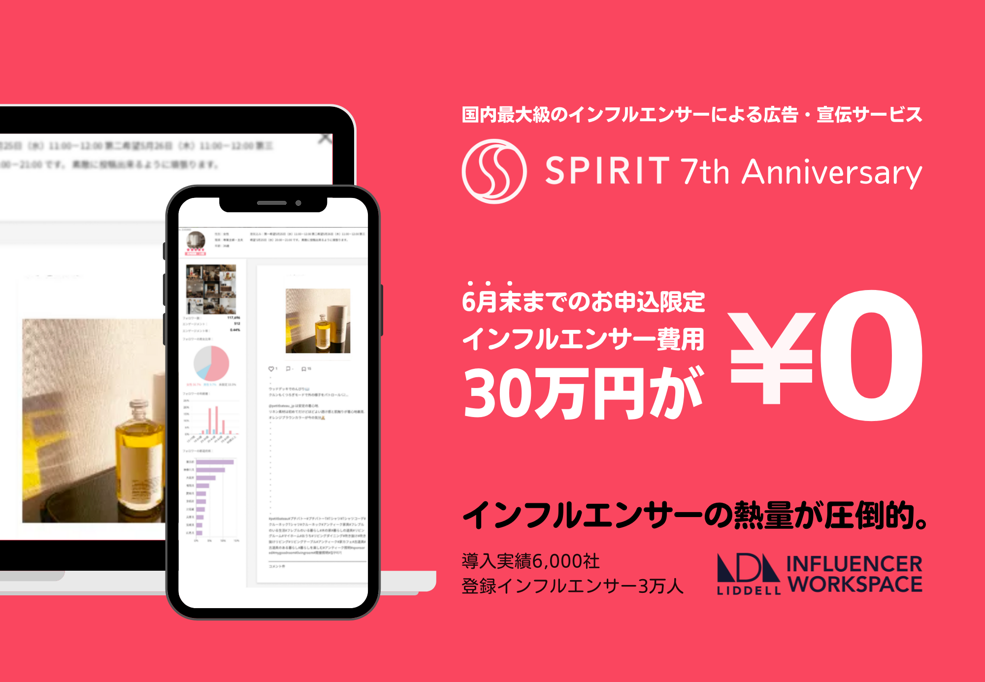 インフルエンサーマーケティング事業を展開するLIDDELL株式会社 (本社:東京都港区、代表取締役:福田 晃一、以下リデル)は、インフルエンサーの体験によって広告・宣伝するサービスである『SPIRIT(スピリット)』の7周年を記念し、「インフルエンサーの効果を数値化できるSNS広告プラン」において、「インフルエンサー費用無料」のスペシャル特典を提供する、《 SPIRIT 7th Anniversary campaign 》を開始いたします。