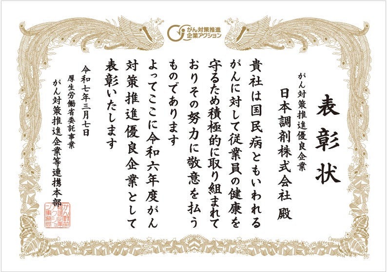 全国47都道府県で調剤薬局を展開する日本調剤株式会社(本社所在地:東京都港区芝、代表取締役社長:笠井 直人、以下「日本調剤」)は、2025年3月7日に厚生労働省が推進する「がん対策推進企業アクション」における「がん対策推進優良企業表彰制度」にて、「令和6年度 がん対策推進優良企業」として表彰されました。