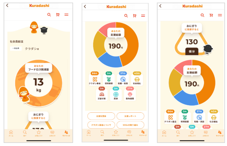 お買い物を通じてどれだけ社会貢献をしたか、フードロス削減量などの社会貢献度合いがマイページ内で可視化されます。