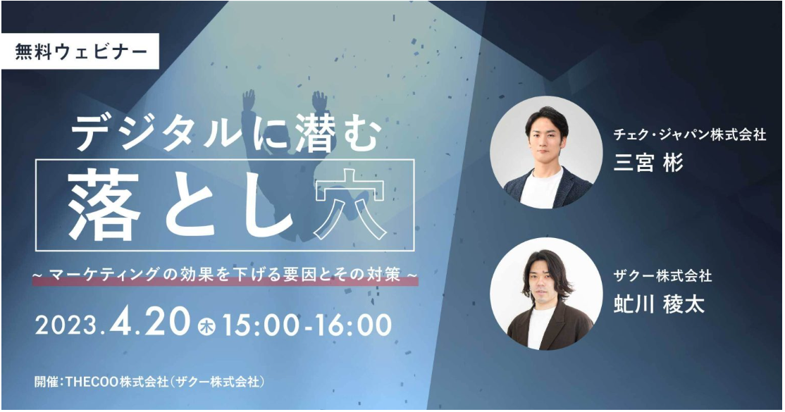 デジタル広告及びインフルエンサーマーケティング事業を行うTHECOO株式会社(本社:東京都渋谷区、代表取締役CEO:平良真人、証券コード:4255、以下「当社」)は、CHEQ Japan株式会社(本社:CHEQ AI Technologies Ltd. 米国 ニューヨーク)と2023年4月20日(木)15:00~ 共催セミナー「デジタルに潜む落とし穴 ~マーケティングの効果を下げる要因とその対策~」を開催します。