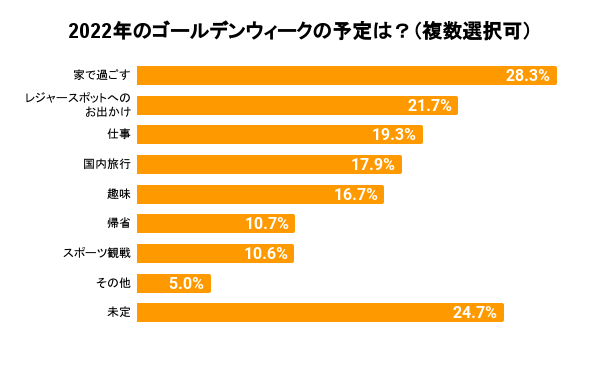今年のゴールデンウィークの予定を聞いたところ、「家で過ごす(28.3%)」が最も多い結果となりました。理由を聞くと「のんびりしたい」「コロナ禍だから混雑を避けたい」「ペットと過ごす」などの回答がありました。