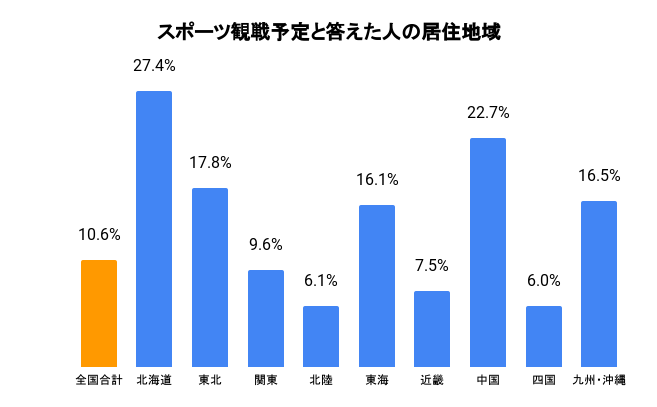 「スポーツ観戦」と回答した人を居住地域別に見てみると、「北海道(27.4%)」、「中国地方(22.7%)」は全国合計10.6%に対し10ポイント以上高く、逆に「北陸(6.1%)」、「四国(6.0%)」は6%程度と地域によってばらつきが出る結果となりました。