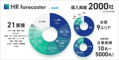 「HR forecaster」は、2021年11月のサービス提供開始から、わずか1年半で累計導入社数2,000社を突破しました。中途採用の過程で発生する「欲しい人材の年収の相場感が分からず適切な年収が設定できない」「募集しているが欲しい人材が集まらない」といった採用担当者が抱える課題に対して、転職サービス「doda」が培った100万件以上の転職データを統計し、それらの解決と継続的な改善につながるデータや情報の提供を行ってきました。