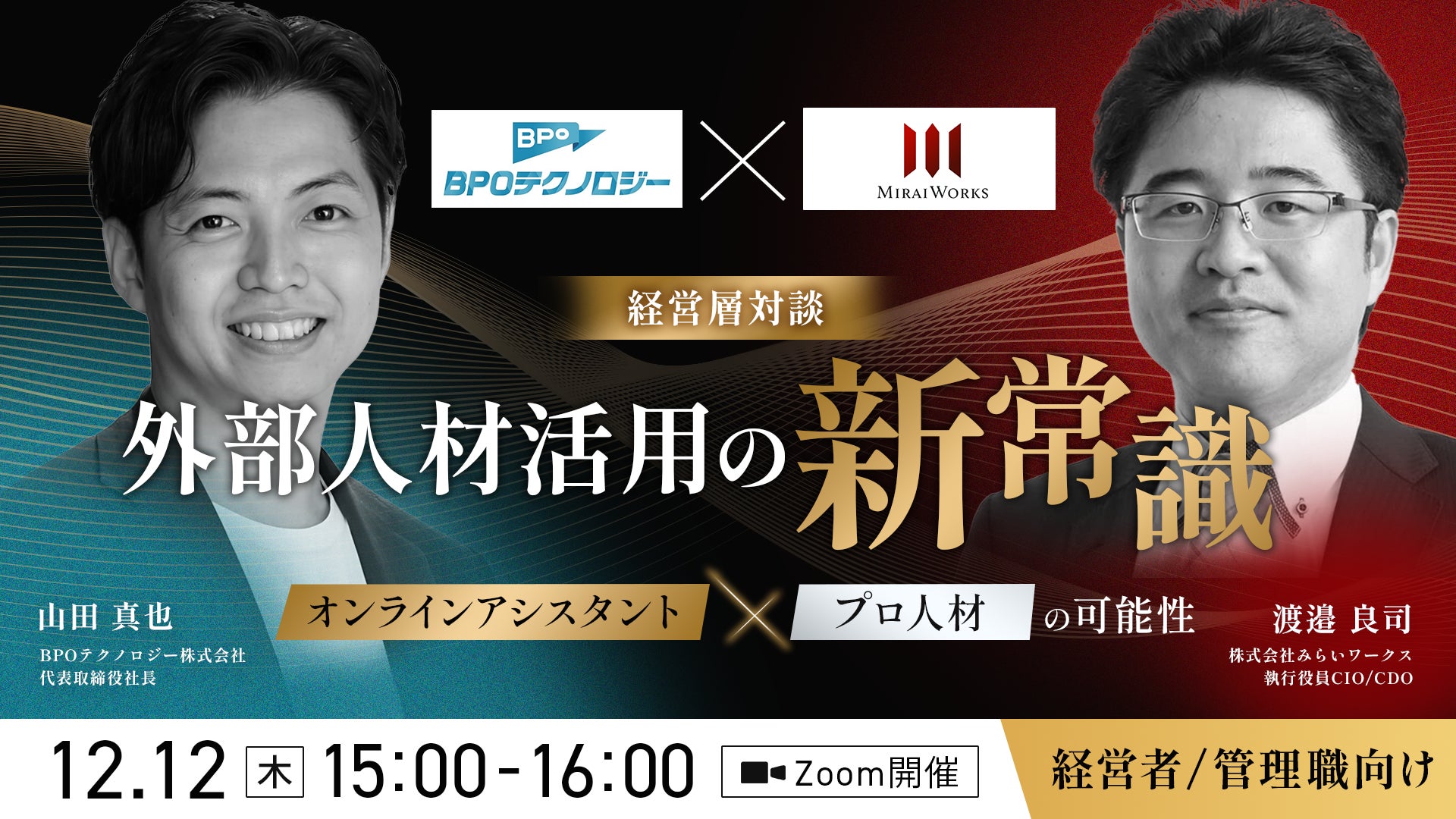 株式会社みらいワークス(本社:東京都港区、代表取締役社長 岡本 祥治、以下「当社」)は、2024年12月12日(木)に【経営層対談】外部人材活用の新常識オンラインアシスタント×プロ人材の可能性における、オンラインセミナーを開催します。