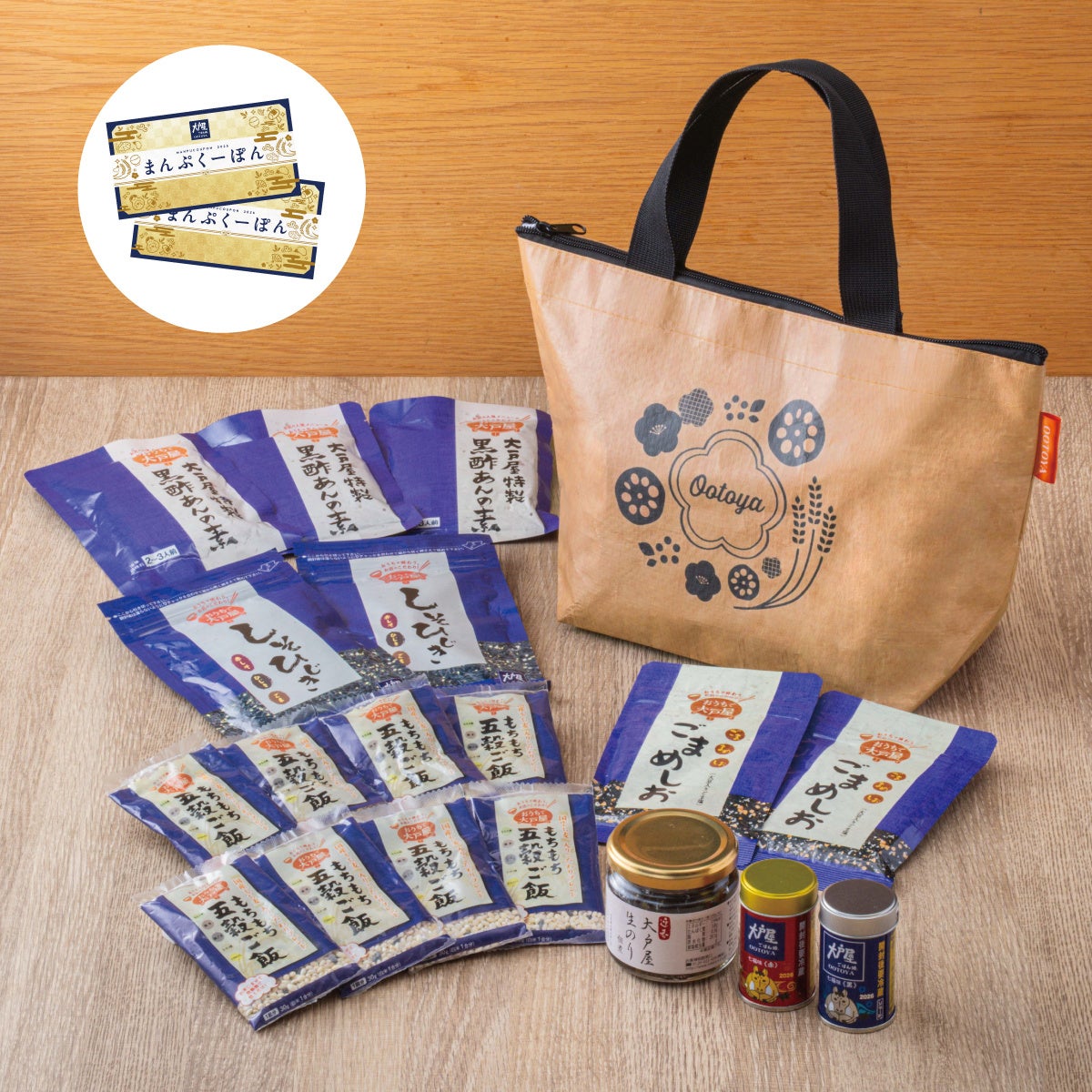 おうちでも大戸屋の味をお楽しみいただける人気のオリジナル商品や、全国の大戸屋ごはん処でご利用いただけるお得な「まんぷくーぽん」が入った、うれしい特典いっぱいの「大戸屋まんぷく袋」です。日本三大七味のひとつ"八幡屋礒五郎"とのコラボ七味は、2026年の干支をデザインした限定缶で登場。さらに今年は、新たに“小豆島産の海苔”を使用した「大戸屋 生のり佃煮」も仲間入りし、大戸屋のお弁当がぴったり入る「オリジナルお弁当バッグ」に詰め込みました。