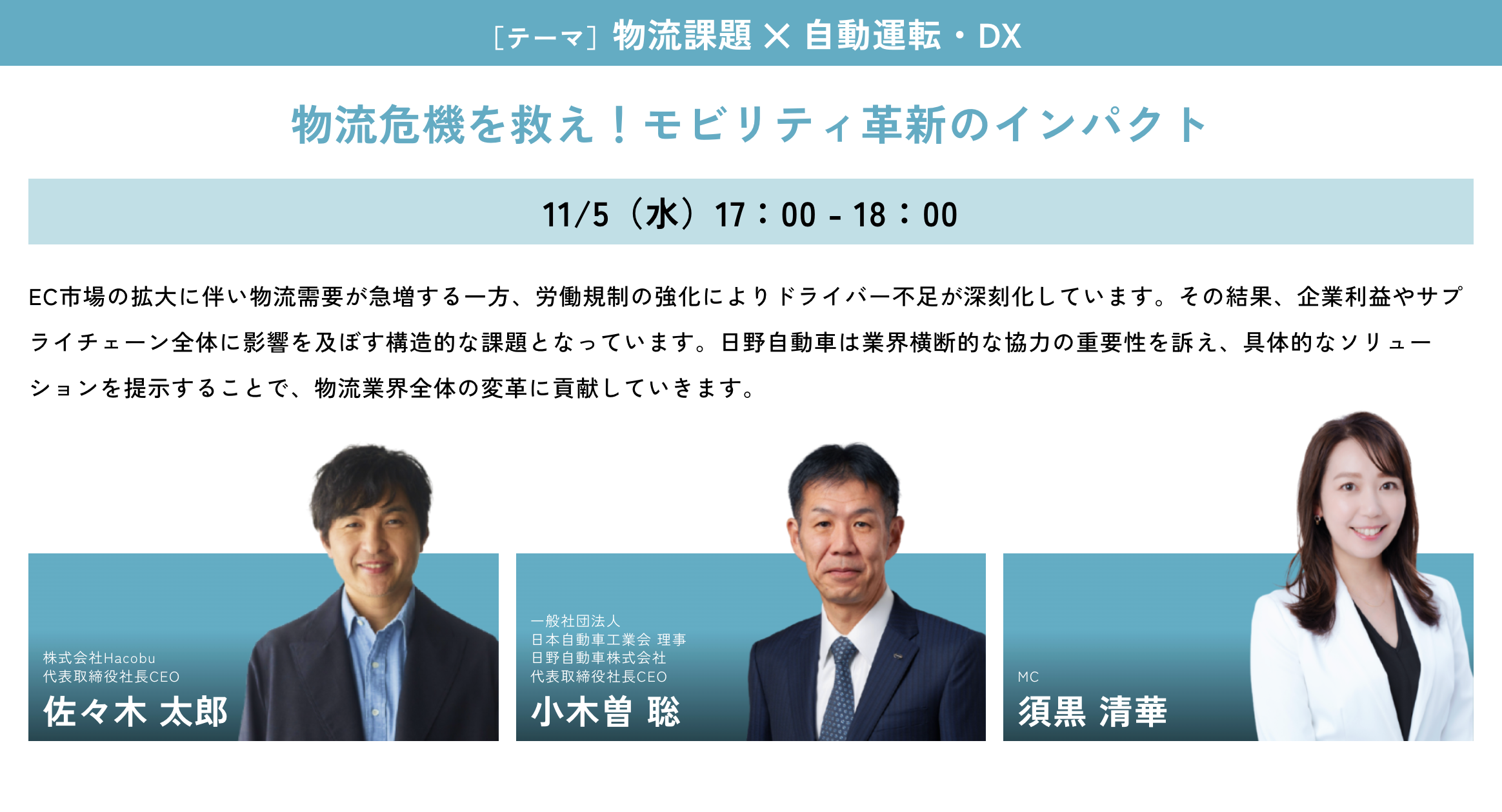 データの力で物流課題を解決する株式会社Hacobu 代表取締役社長CEO 佐々木 太郎は、11月5日 17:00より、Japan Mobility Show 2025の未来モビリティ会議 において、「物流危機を救え!モビリティ革新のインパクト」と題したビジネスセッションに登壇いたします。