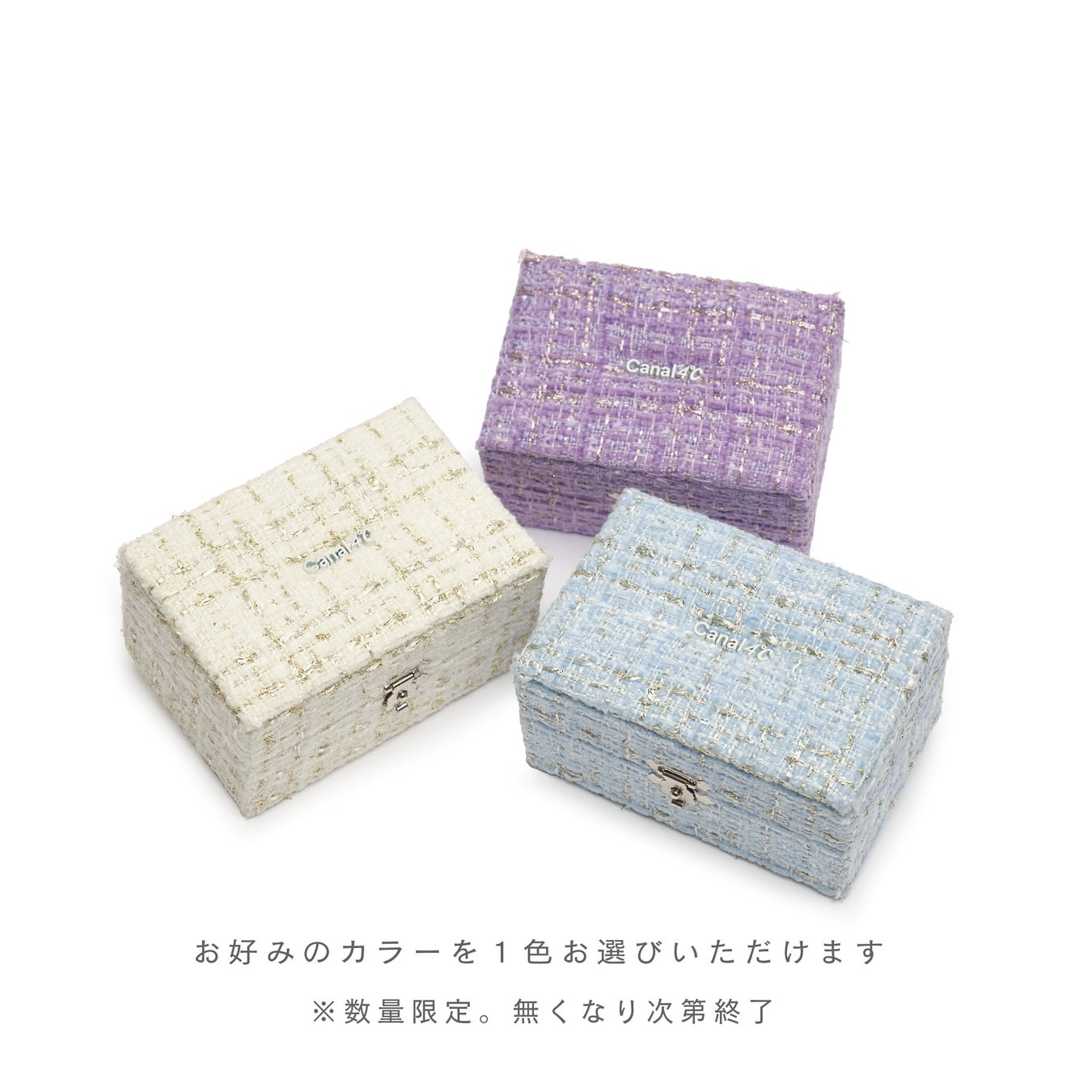 2024 Winter Collectionのジュエリーは、きらめくラインが特別感を感じさせるツイード素材の限定ケースにお包みしてお渡しいたします。今年のクリスマスコレクションを象徴する3つのカラーリングからお選びいただけます。リング差しも付いた実用的なケースは、ギフトにも喜ばれるはず。