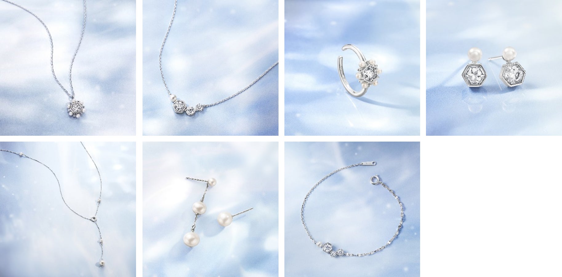 しんしんと降り積もる雪やきらめく結晶をイメージした、冬らしいシルバージュエリーが登場。幸運を運ぶとされる6角形のオリジナルカットを施したネックレス、リング、ピアス、ブレスレットは、光穴の形状にもこだわり、上品な輝き方をデザイン。パールをあしらったアウトラインは華やかでありながらも、すっきりとしたオリジナルカットが加わることで、モダンさと可愛らしさを兼ね備えた印象をもたらします。
