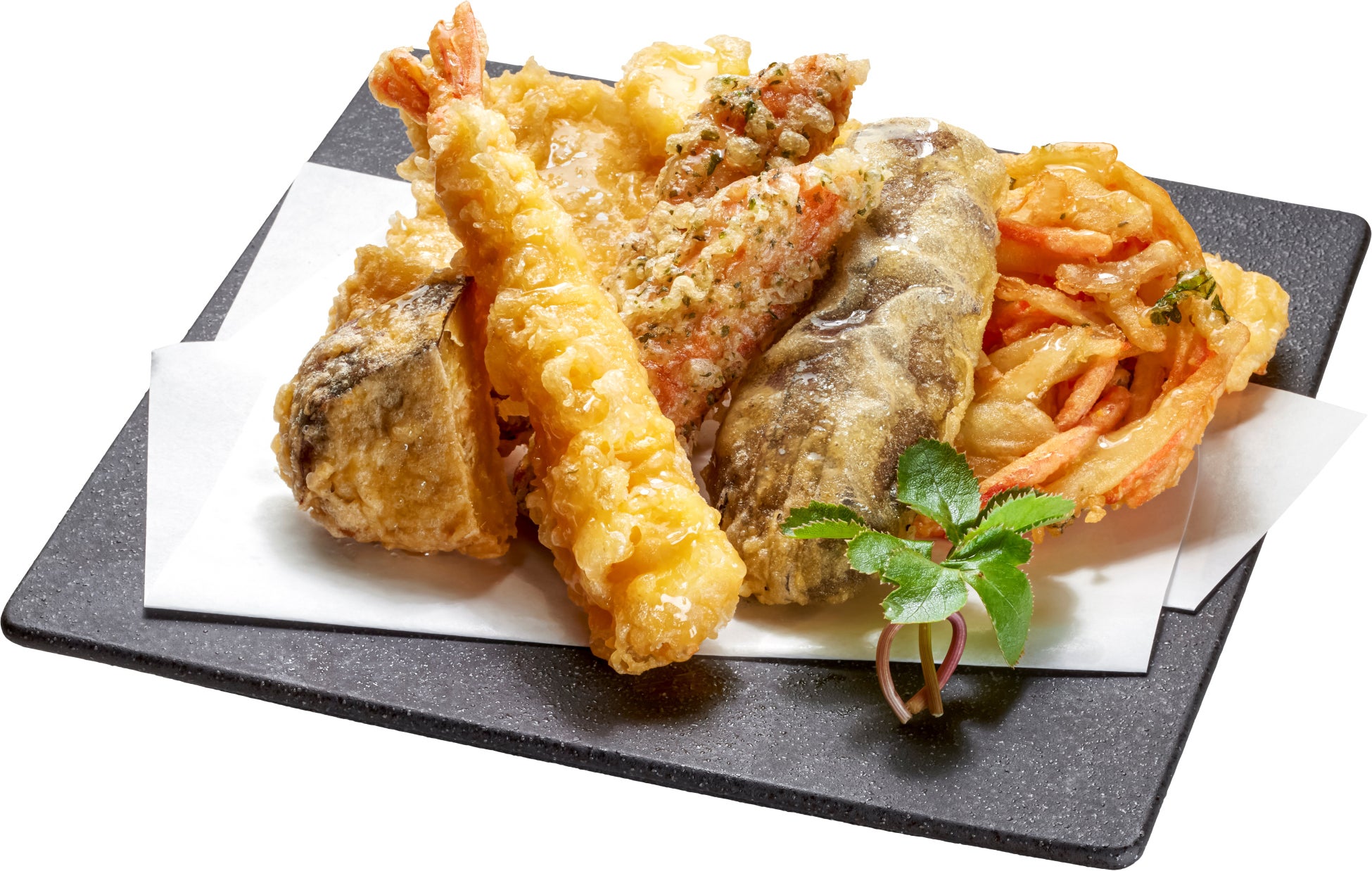 大海老天200円、とり天170円、野菜かき揚げ160円、いか天160円、ちくわ磯辺揚げ130円、