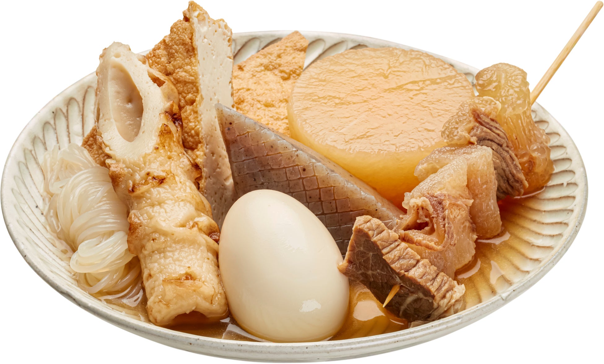 はなまるのおでんは、魚介系をベースにおでんダネの旨味に負けないよう強めの出汁を使用し、店舗で丁寧に煮上げています。人気のおでんダネの大根、たまご、こんにゃく、牛すじ、厚揚げ、白滝、ちくわをご用意しています。
