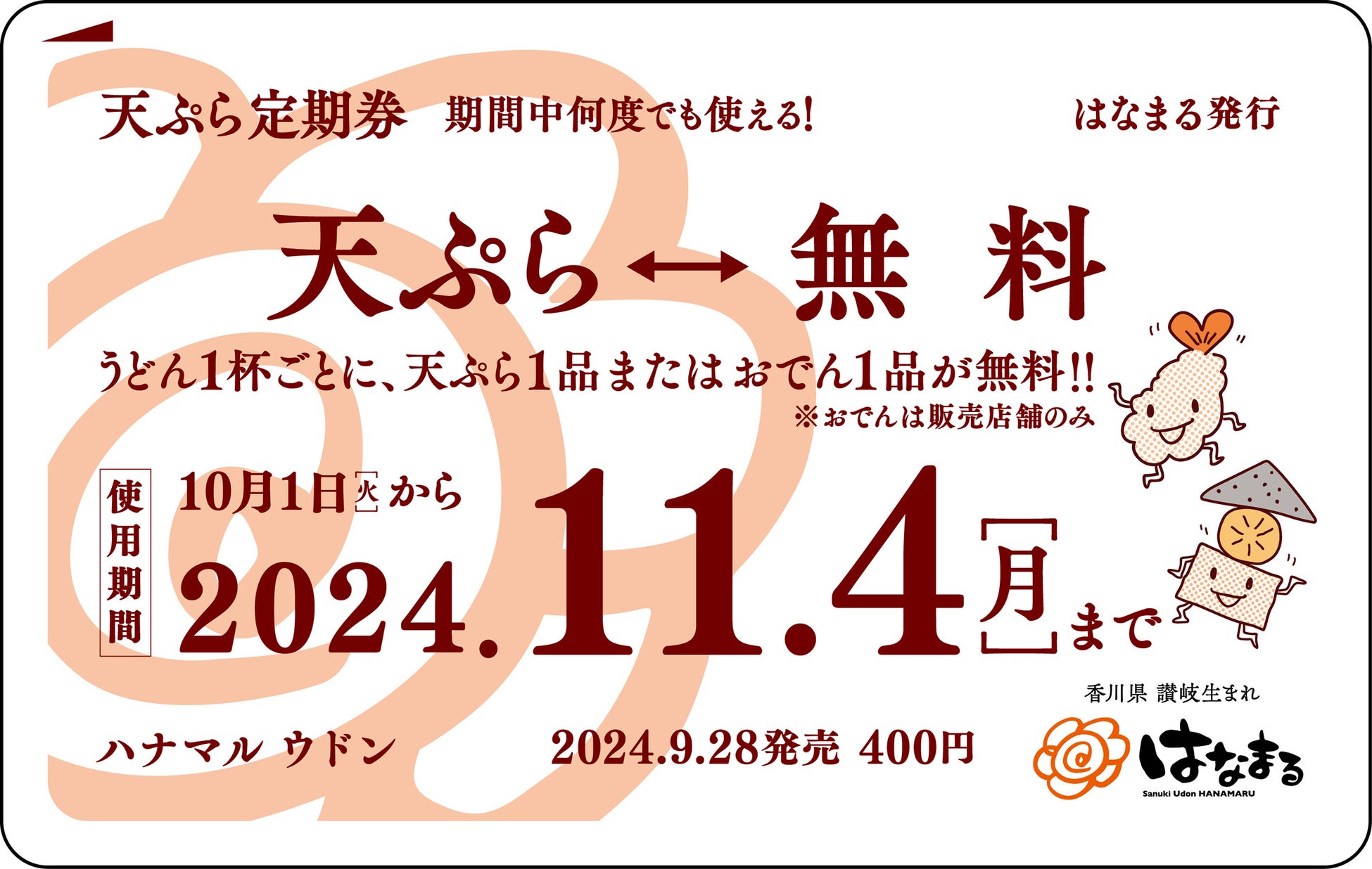 讃岐うどんチェーン「はなまるうどん」を展開する株式会社はなまる(本社:東京都中央区 代表取締役社長:前田良博、以下はなまる)は、2024年9月28日(土)より、全国の「はなまるうどん」「うまげな」「つるさく」「さぬき麺屋」「高松勅使」「東京肉芝」各店舗(※一部店舗除く)にて、うどん1杯ごとに、天ぷらまたはおでん1品が無料で楽しめる『天ぷら定期券』を数量限定で販売いたします。