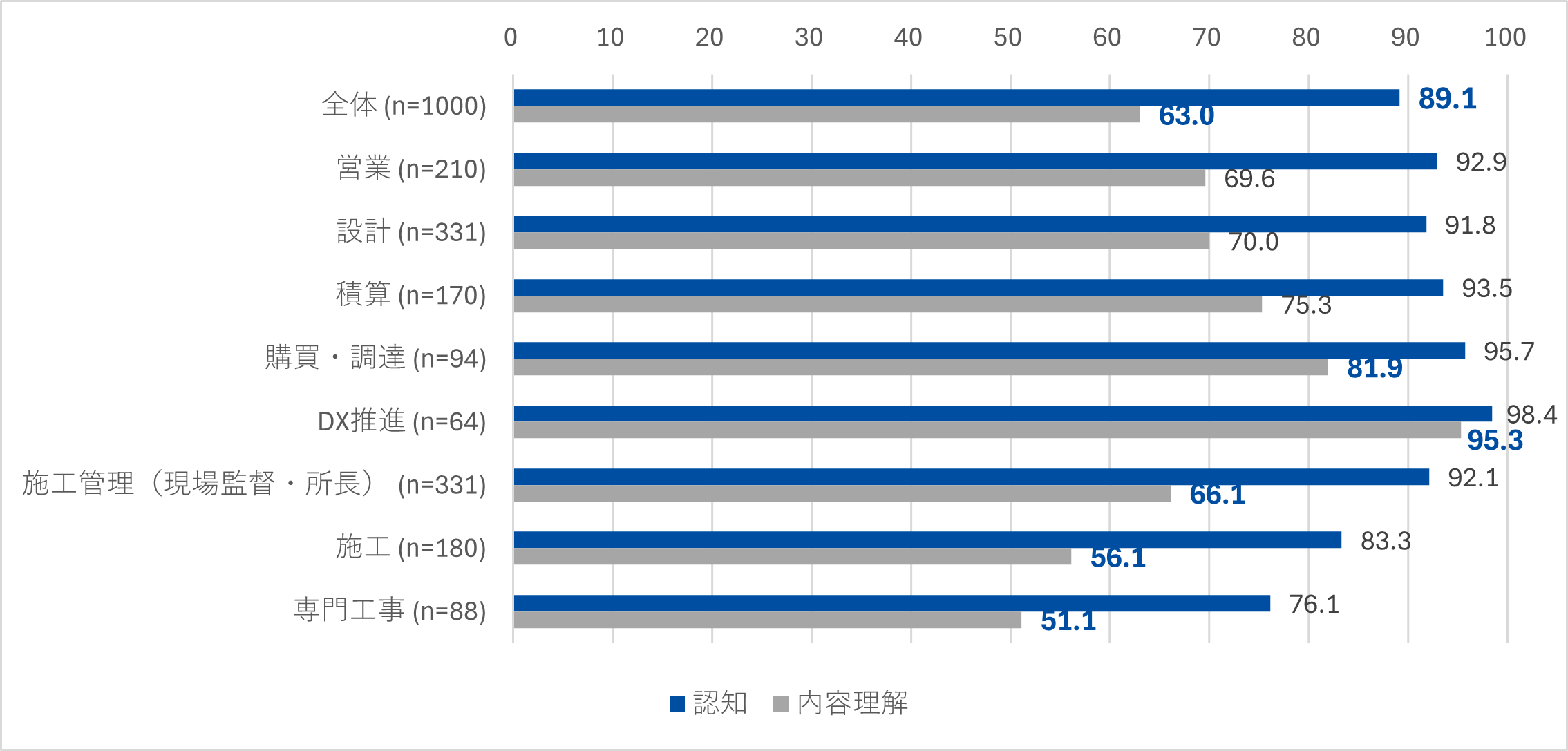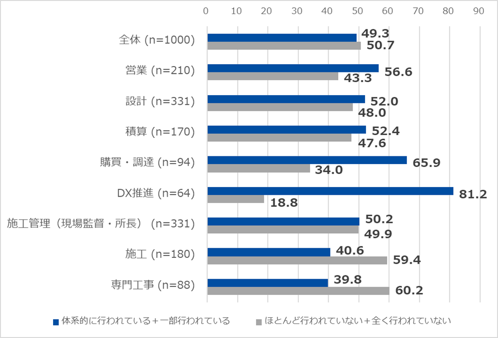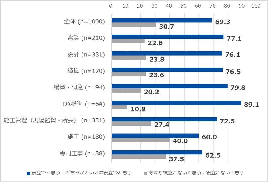 内容理解度を職種別にみると、1位は「DX推進部門」(95.3%)、2位が「購買部門」(81.9%)と高く、意外なことに、現場に近い職種では、「専門工事」(認知76.1%、理解51.1%)、「施工」(認知83.3%、理解56.1%)、「施工管理(現場監督・所長)」(認知92.1%、理解66.1%)では内容理解度が低い結果に。