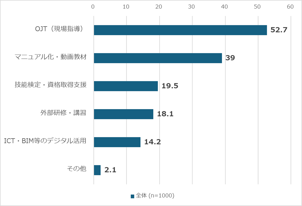 ●最も有効な取り組みは「OJT」「技能検定・資格取得支援」だが、現場では教育時間が不足