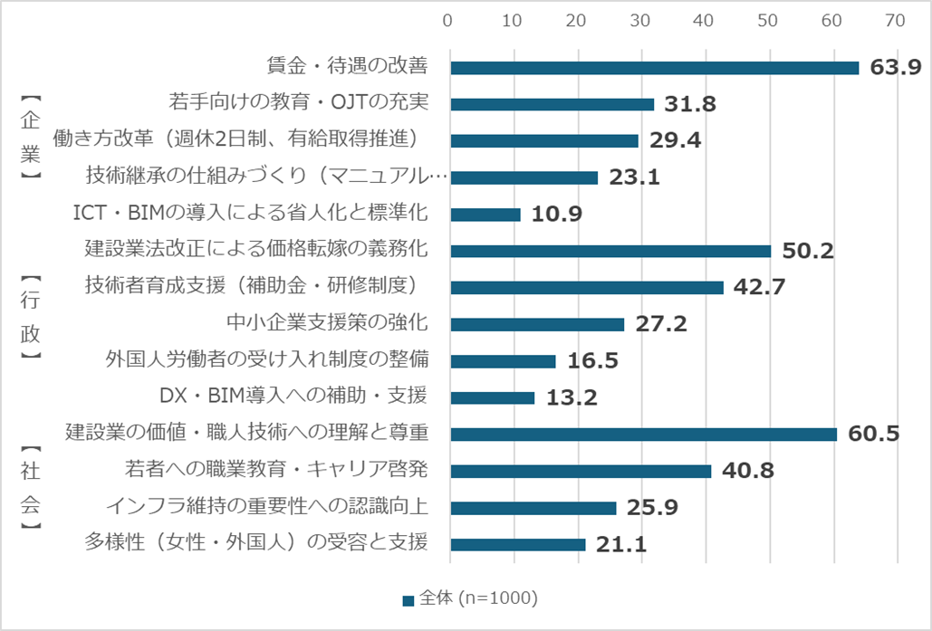 企業には63.9%が賃金・待遇改善求め、行政には50.2%建設業法改正による価格転嫁義務化、社会に対しては60.5%が職人技術への理解と尊重を求めており、こうした喫緊の課題として挙がる。 特に社会に対しては、別質問でも「職人技術の価値が軽視されている」と感じる人が12.1%おり、大手メディアが建設業界を取り上げるのは事件や事故の時だけという風潮も見直される必要がある。