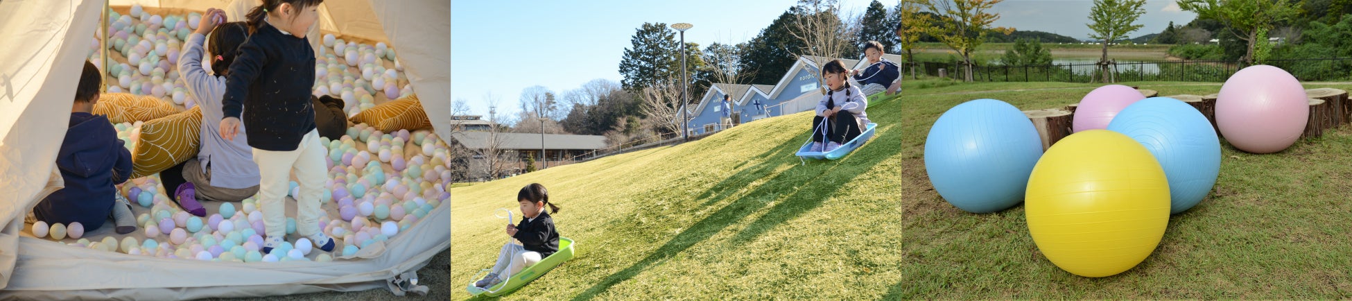 「楽しく身体をつかって遊ぶ」をコンセプトに、ボールプールテントや芝そり、「けんけんぱ」などの遊び道具が勢ぞろい。さらに、大きな柔らかいボールで思いっきり遊べるエリアが新登場!
