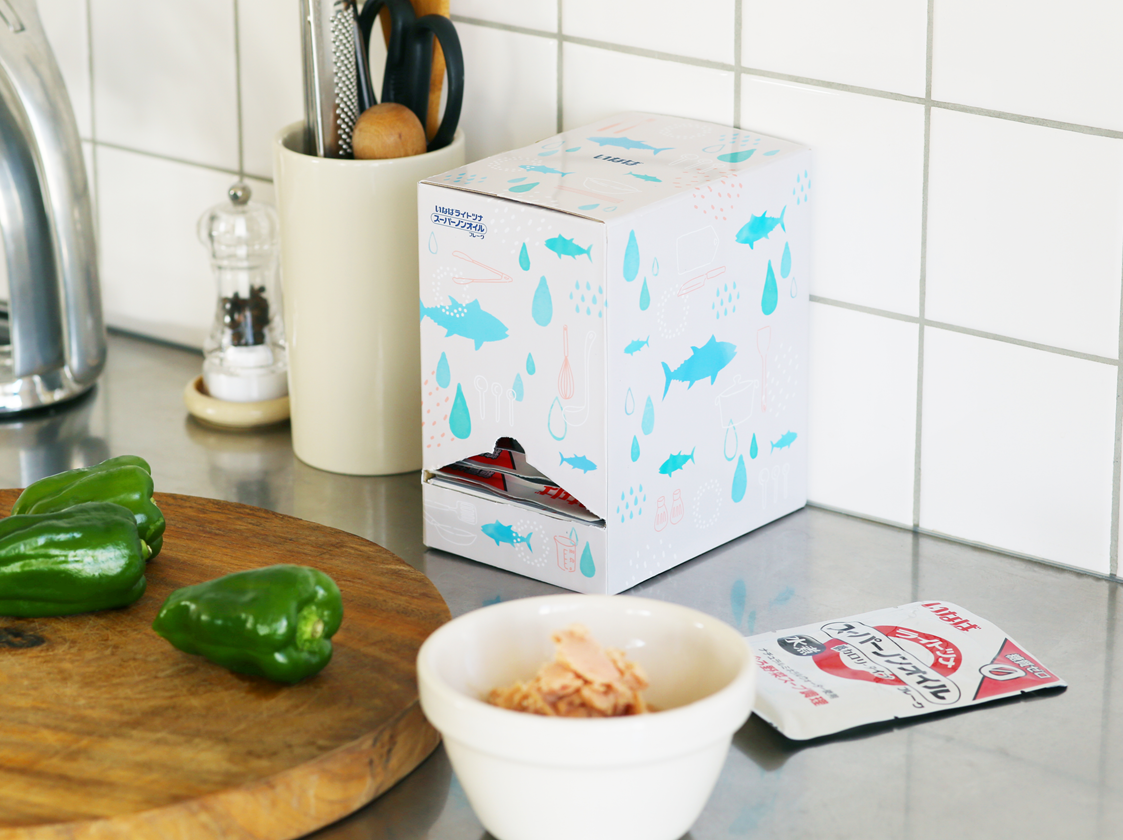 パッケージには、調味料や料理器具、水滴(※)をモチーフにしたデザインを施しました。