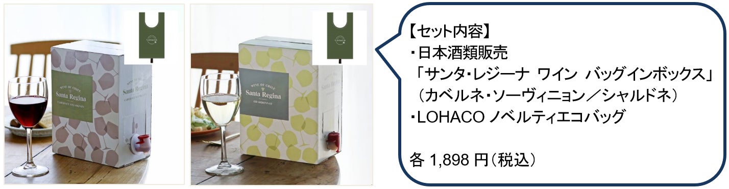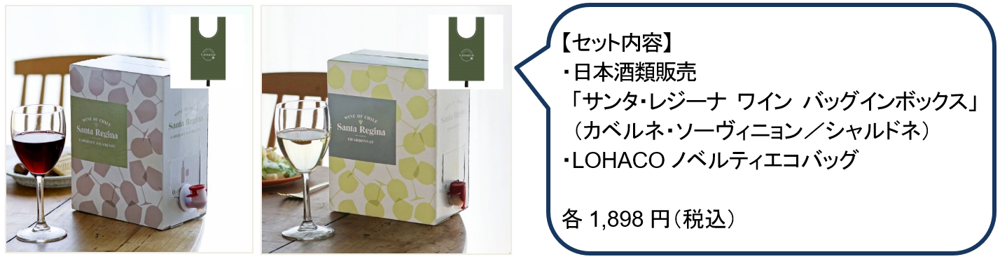 今回のLOHACO展出展商品の中から、日本酒類販売「サンタ・レジーナ ワイン バッグインボックス」(カベルネ・ソーヴィニョン/シャルドネ)とノベルティのLOHACOエコバッグをセットにし、数量限定で販売します。人気のサンタ・レジーナワインのLOHACO限定デザインで、食卓やリビングなどで飲用いただいてもお部屋の雰囲気になじむ仕様になっています。商品の詳細は、本プレスリリース3ページ目をご参照ください。