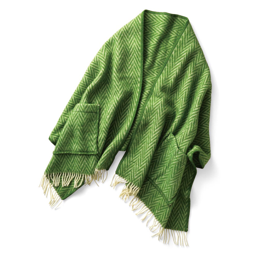 濃淡のあるヘリンボーンが目を引くポケット付きのウールショール。生後一年以内に刈り取られた羊毛からできたピュアニューウール100%の素材は、軽くて通気性が良く、秋から春まで活躍します。また膝掛けとしても使えます。
