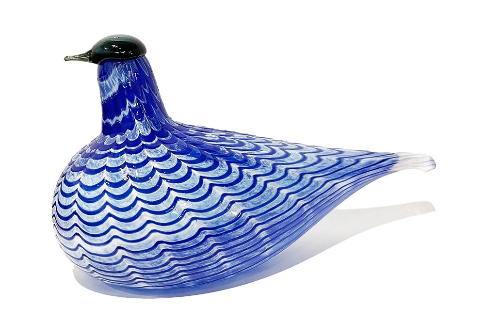 フィンランドのガラスデザイナー オイバ・トイッカ氏が手掛けた青い鳥のオブジェ。青と白の羽模様に、ブルーグリーン主体の複雑な色合いの頭部が魅力です。受注生産のみで販売されていたバードは手吹き技法で作られており、一点一点表情が異なります。