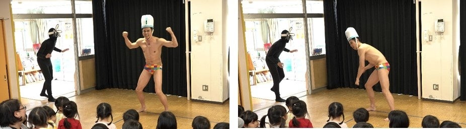 園児達が先生の合図で座ると、そこには巨大な『アースノーマット』の箱が。園児たちが大きな声で「お願いしまーす!」と呼ぶと、「デデデン、デデデン♪」の出囃子とともに小島さんが登場。園児達の驚く顔や歓声にご注目ください。