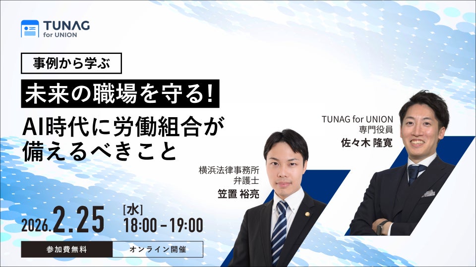 株式会社スタメン(東京本社:東京都千代田区、代表取締役:大西 泰平、以下 当社)が開発・提供する「TUNAG for UNION(ツナグ フォー ユニオン、https://biz.tunag.jp/lp/union)」は、横浜法律事務所/弁護士、笠置裕亮氏と、2026/02/25(水)18:00〜19:00に参加無料のオンラインセミナーを開催いたします。