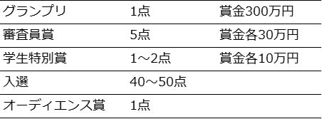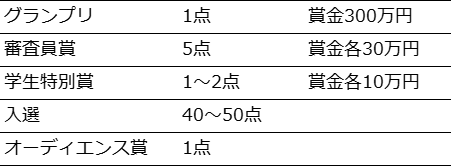 以下のとおり、受賞・入選作品を選出予定です。