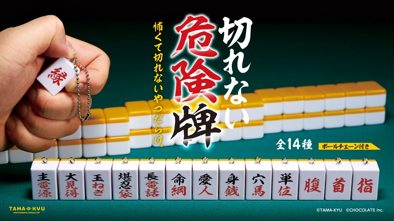 コンテンツスタジオ CHOCOLATE Inc.(本社:東京都渋谷区、代表取締役:渡辺裕介)が企画を手がけたカプセルトイ「切れない危険牌」が、本日6月29日に株式会社ブシロードクリエイティブ(本社:東京都中野区、代表取締役社⻑:成⽥耕祐)のオリジナルカプセルトイブランド『TAMA-KYU(たまきゅう)』より発売され、全国のカプセルトイ自販機にて順次販売が開始いたします。本商品は、 世の中に存在する怖くて“切れない”ものを麻雀牌に記したカプセルトイで、2021年10月に発売した「切りたい麻雀牌」に続く、麻雀牌モチーフのアイテム第2弾となります。ラインアップは「縁」「命綱」「愛人」など、全14種類を揃えています。