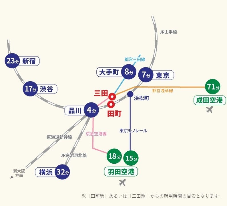 当施設が位置する田町・三田エリアは、大規模な再開発が進む高輪ゲートウェイ駅や、リニア中央新幹線の始発駅となる品川駅に近く、近年は国際競争力の強化に向けて再開発や道路整備等が進んでいます。東京駅や品川駅、大手町駅といった都内の主要ビジネスエリアには10 分圏内で、羽田空港への入り口となる東京モノレールの発着駅である浜松町駅は隣駅のため、交通の要衝としての重要度が一層高まっているエリアです。2020年の「msb Tamachi(ムスブ田町)」全体開業や2023年の東京三田ガーデンタワー竣工、さらに現在進められている田町駅西口駅前地区再開発では「田町タワー」が完成しており、今後ビジネス拠点としての優位性はさらに高まることが予想されます。