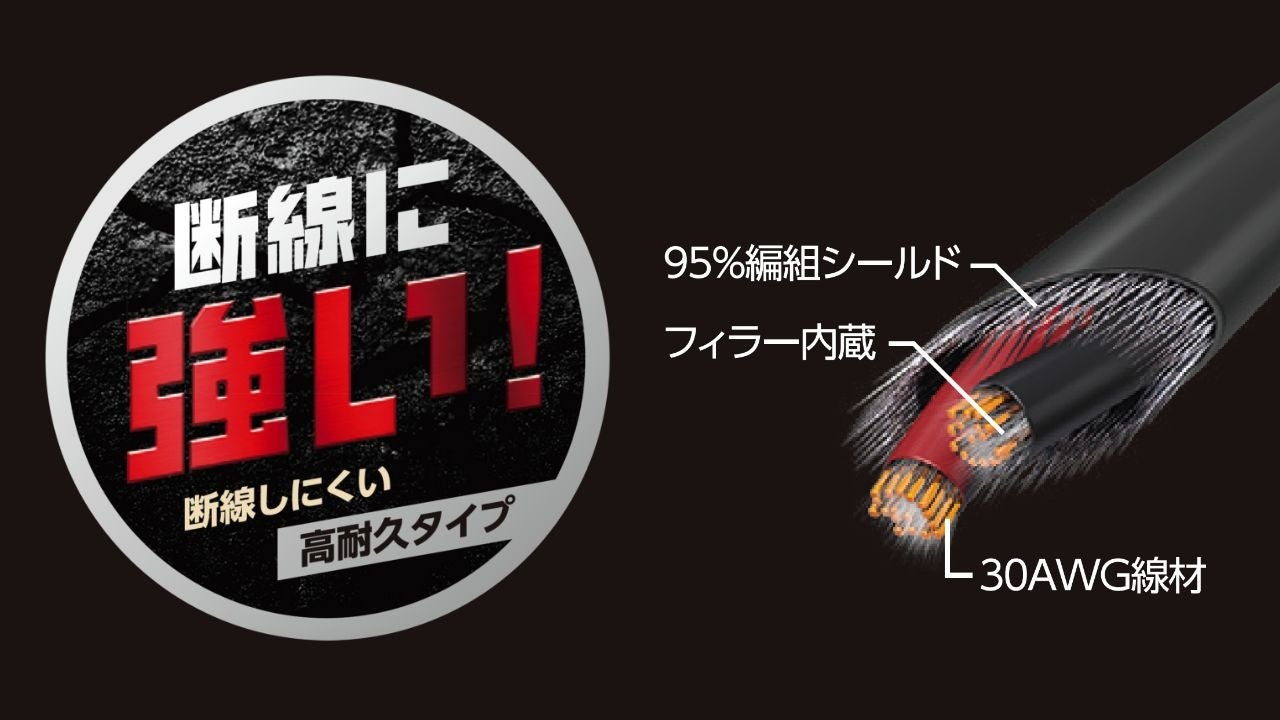 配線内部の密度を高め、屈曲に対する耐久力を強化する95%編組シールドを使用しています。