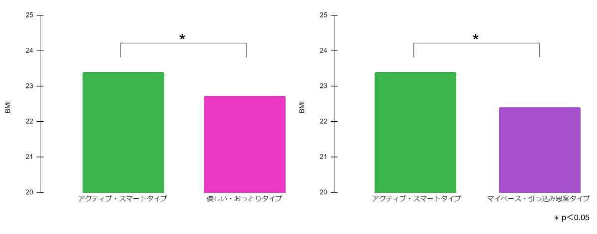 1.「アクティブ・スマート」タイプに比べて、「優しい・おっとり」タイプと「マイペース・引っ込み思案」タイプはBMIが有意に低い