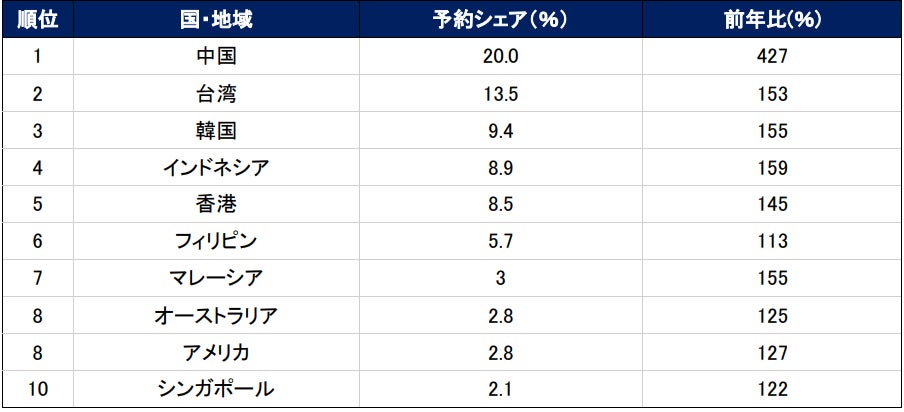 なる約17万人に達しました。利用者の国籍は184カ国にわたり、特に中国(20.0%)、台湾(13.5%)、韓国(9.4%)、インドネシア(8.9%)、香港(8.5%)が上位を占めました。東アジア圏の利用が多い一方で、オーストラリアやアメリカからの予約も増加し、各国ごとに異なる人気エリアの傾向が明らかになりました。