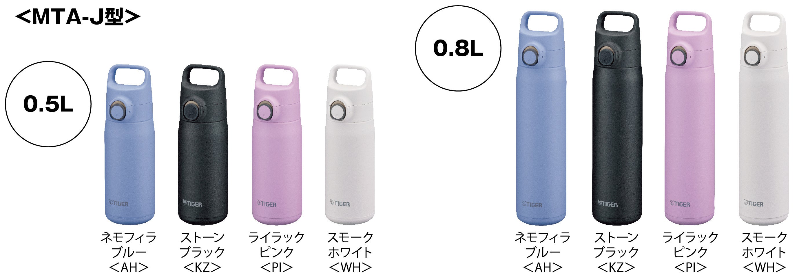 同日に新発売の「真空断熱ボトル MTA-J050/J080」は、MCZ-G型と同じく「らくらくキャップ」を搭載し、スラントハンドルつきで持ちやすく、さらにワンプッシュせんでふたが簡単にオープンするので、すばやく水分補給をすることができます。