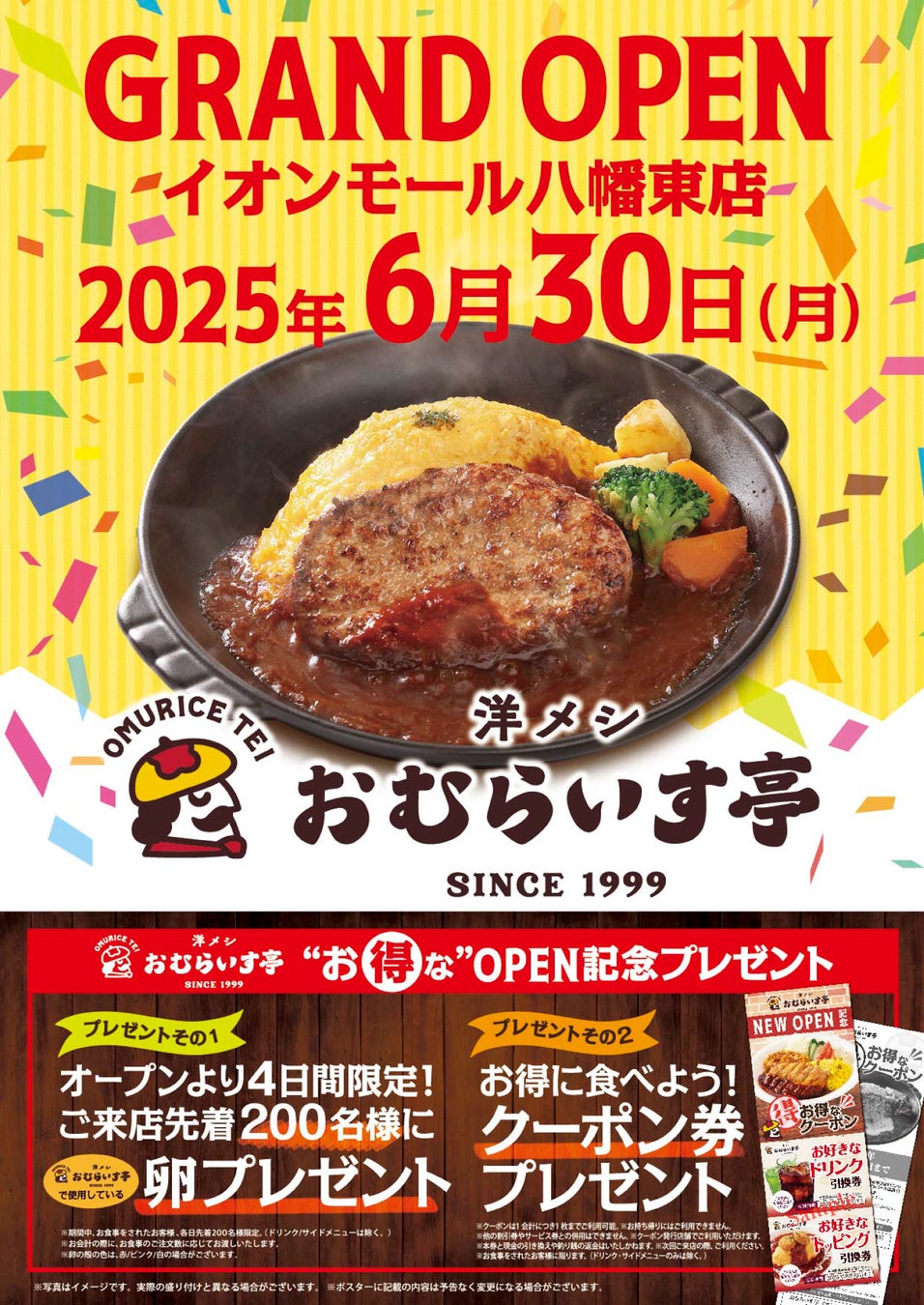 “ふわトロ” オムライスの「おむらいす亭」では北九州イオンモール八幡東店を6月30日(月)にグランドオープンいたします。西日本を中心に34店舗を展開し、福岡県内では9店舗目となります。そして、今回はオープン特別記念プレゼントを2種類ご用意しております。「おむらいす亭の卵」と「お得なクーポン券」でございます。(プレゼントのお渡しには条件がございます。下記に記載をさせていただきます。)どうぞ、この機会に「おむらいす亭」の美味しさをご堪能ください。真心を込めた調理、サービスで地域の方に末永く愛される店舗を目指しております。皆様のご来店をスタッフ一同お待ちしております。何卒よろしくお願い申し上げます。