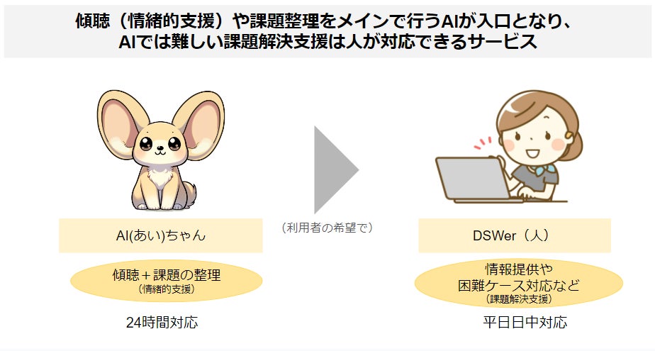 本サービスは、子育てに悩む保護者からの相談に対し、犬のキャラクターAI(あい)ちゃんとして生成AIが返信を行い、必要時には心理士・社会福祉士・保健師等の資格を持つ専門職スタッフが対応する“ハイブリッド型”のSNS相談です。