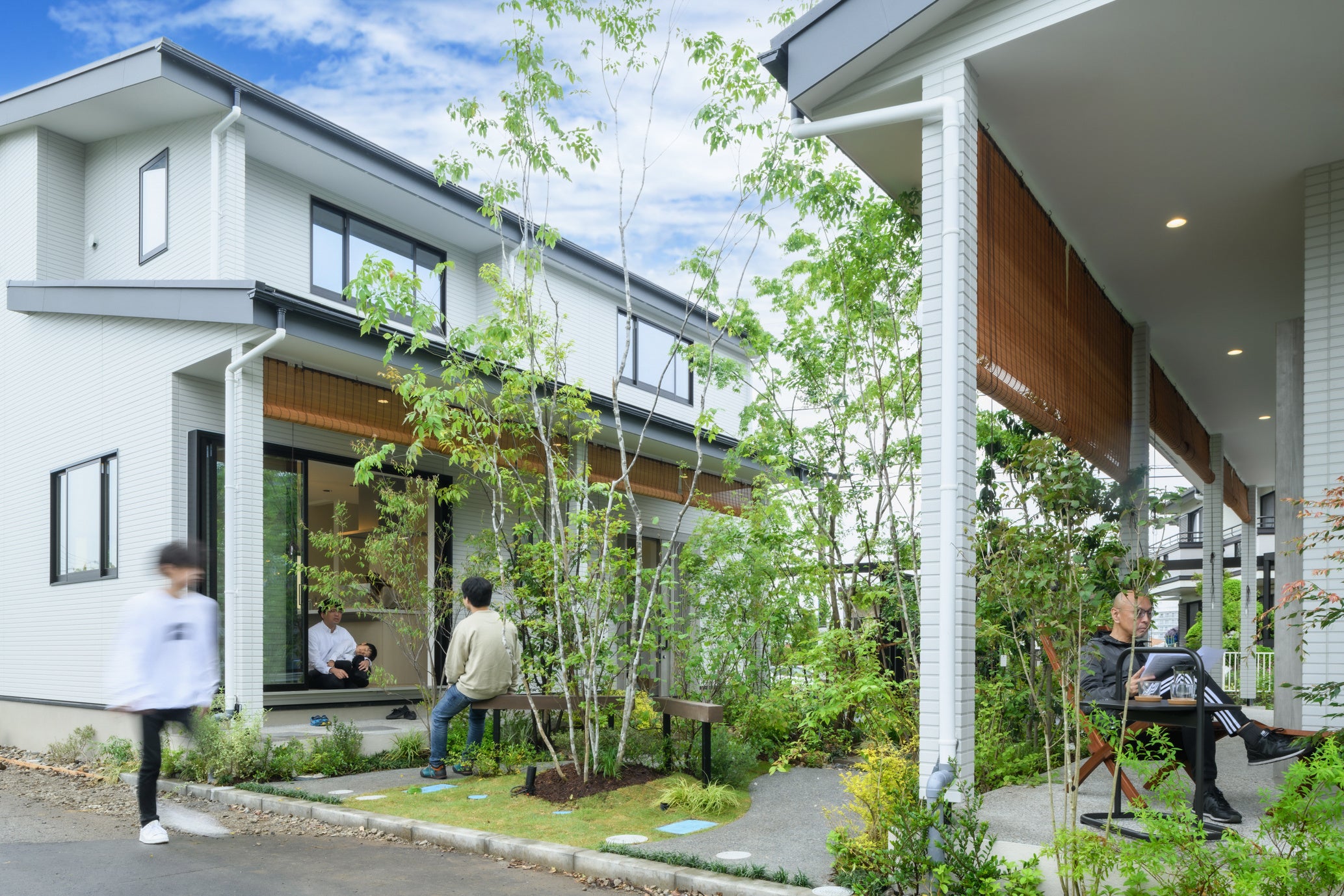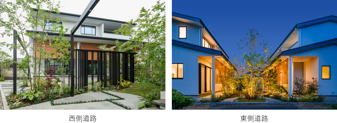 西側道路は、フレームが家の表情を硬くすることで適度な緊張感を与え、東側道路は、たまり空間を設ける事でコミュニティが生まれる『場』となるように設計しました。