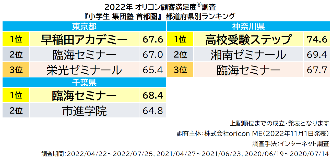 都道府県別では「神奈川県」において3年連続で1位を獲得しています。なお、「東京都」では【早稲田アカデミー(株式会社早稲田アカデミー 本社:東京都豊島区)】が3年連続で、「千葉県」では【臨海セミナー(株式会社 臨海 本社:神奈川県横浜市)】が3年連続で、1位となっています。