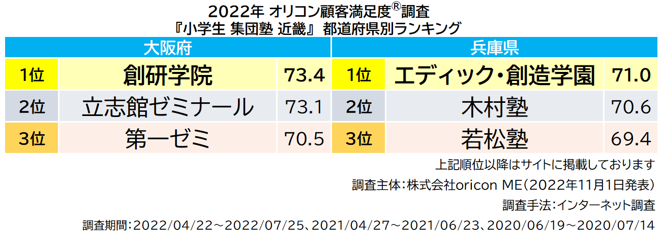 なお、都道府県別「大阪府」では【創研学院(株式会社ヒューマン・ブレーン 本社:大阪府大阪市)】が初の、「兵庫県」では【エディック・創造学園(株式会社創造学園 本社:兵庫県神戸市)】が2年ぶり2度目の1位を獲得しています。