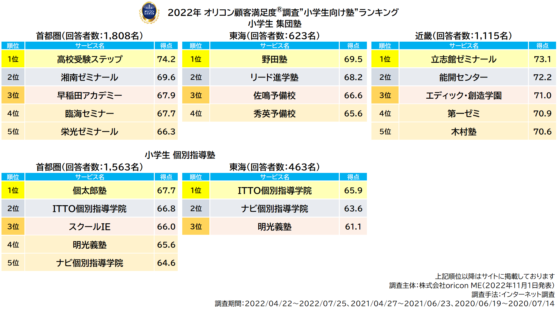 保護者が評価した満足度の高い『小学生』塾ランキング(オリコン顧客満足度®調査)