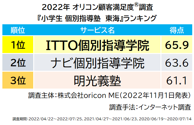 ▶首都圏:千葉県市川市に本社を置く【個太郎塾】が2年連続で総合1位に▶初発表 東海:名古屋市に本社を置く【ITTO個別指導学院】が総合1位に
