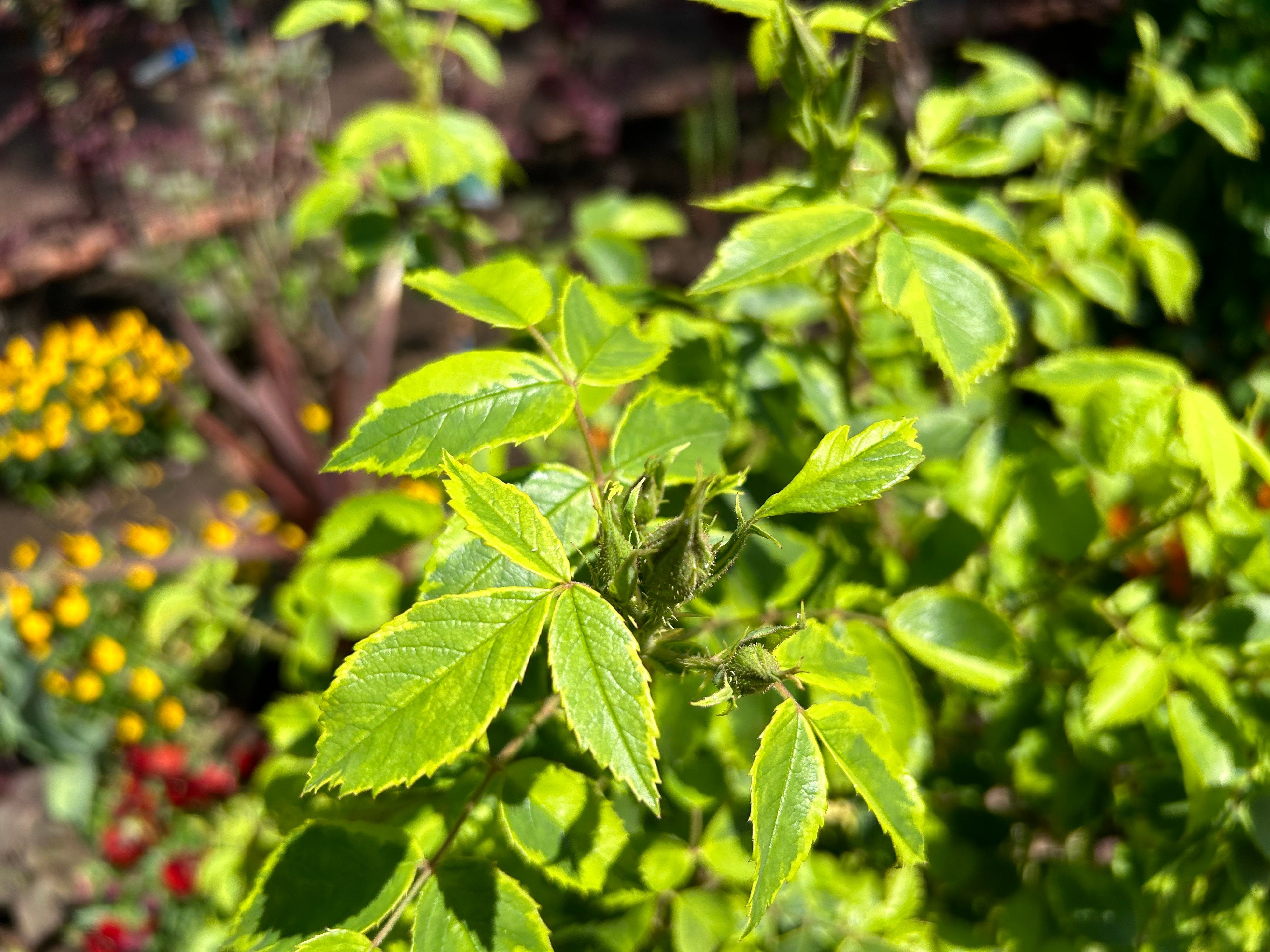 珍しい斑入り葉のバラが見られるエリア(ハーブガーデン)