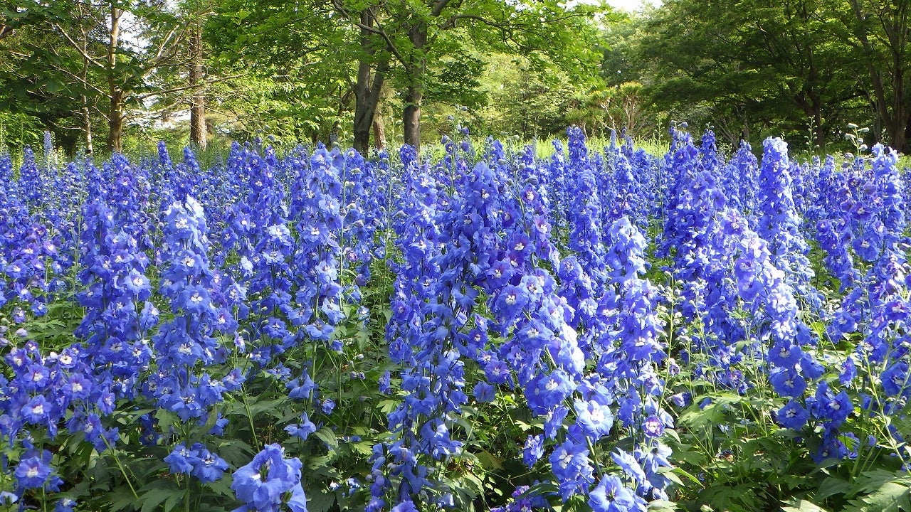 デルフィニウムは1m以上にもなる大型の植物で、花色は青・紫・ピンク・白などがありますが、当園では鮮やかなブルーの品種を中心に約3,000株を植栽。デルフィニウムのみの花畑は比較的珍しく、目の覚めるような青一色の花が広がるのが見どころです。長い花穂にびっしりと八重花をつけ、存在感のある美しさご堪能ください。