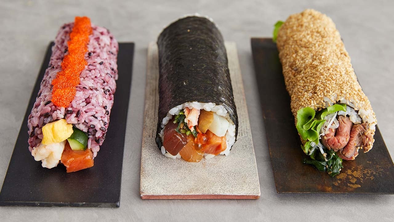 長寿を象徴するエビ、とろけるような旨みのサーモン、こっくり甘い卵焼き、食感のよいキュウリを、黒米と一緒に巻きました。とびっこのぷちぷち感がクセになる、ご家族でたのしめる味わいです。