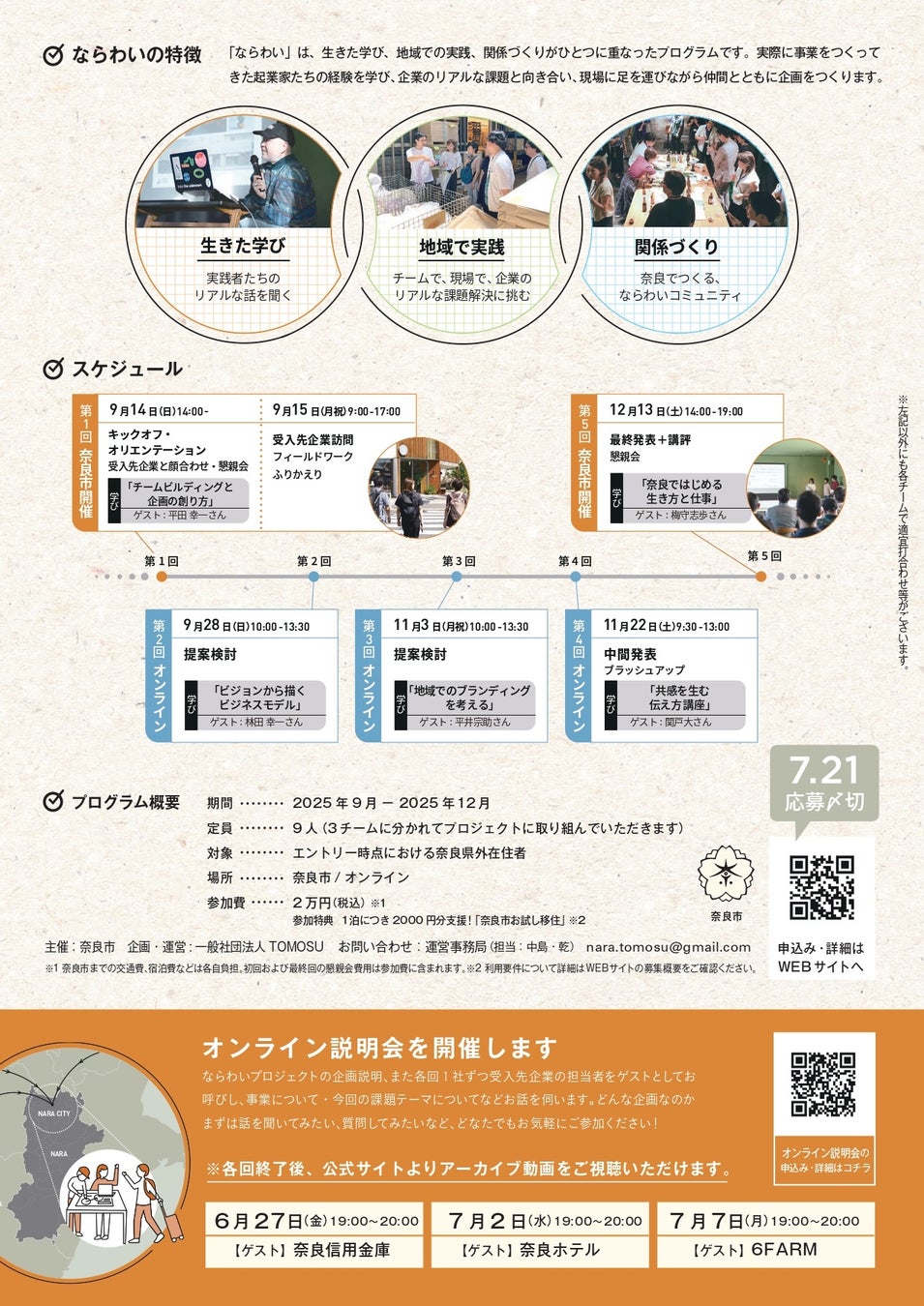 2025年も「ならわい」の開催が決定し、現在参加者を募集しています。参加者募集にあたり、6月25日(水)に東京での連動イベントの開催、6月27日(金)、7月2日(水)、7月11日(月)にはオンラインでプログラム説明会を開催します。