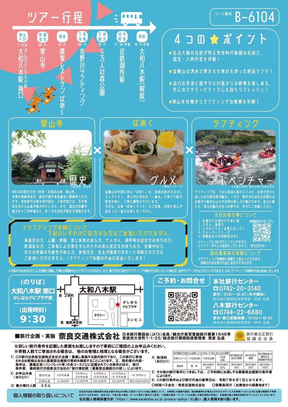 大和八木駅発→榮山寺→農家レストランばあく→吉野川ラフティング→5万人の森公園→近鉄御所駅着(御所宝湯入浴希望者のみ)→大和八木駅着